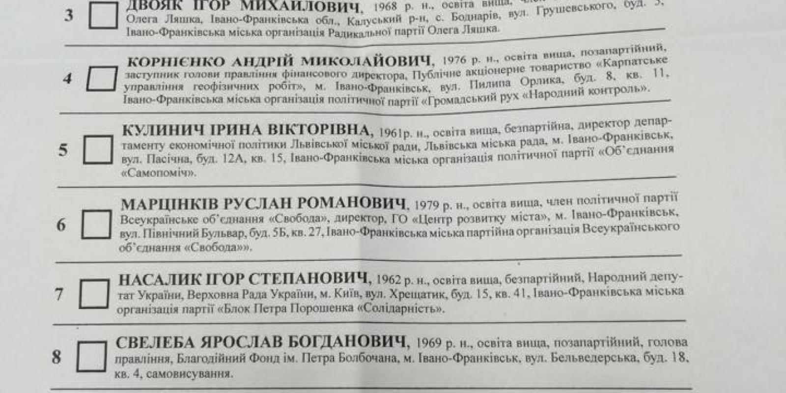 Насалик Ігор Степанович (23 393 голоси) Громадянин України, освіта вища, член Української Народної Партії, Виконавчий комітет Івано-Франківської міської ради, Івано-Франківський міський голова, місце проживання: м.Івано-Франківськ |