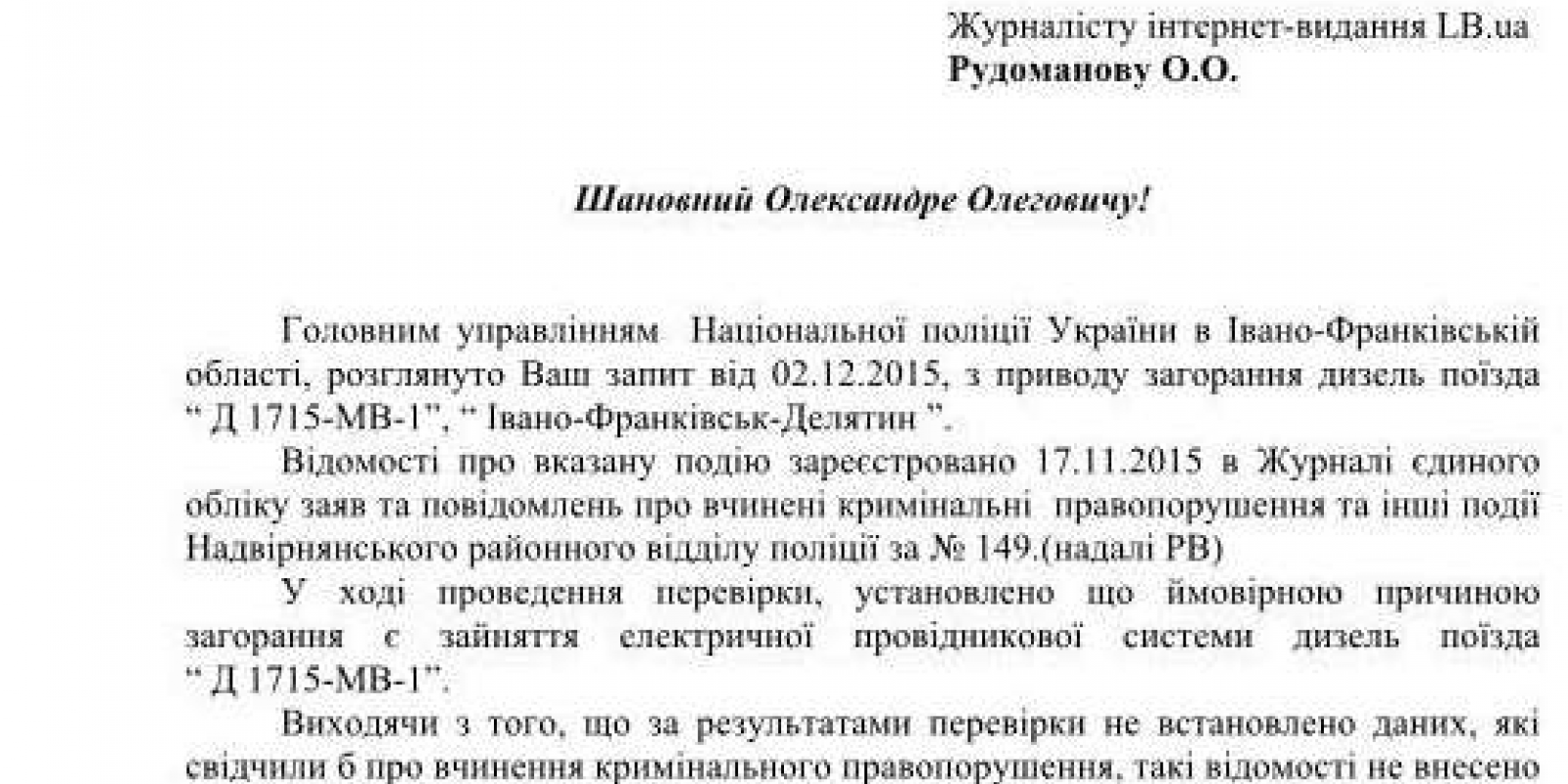"Так от. Львівська залізниця розіслала всім прес-релізи, що це винні п'яні особи. Навіть народним депутатам прислали відповідь, що "причиною пожежі є занесення стороннього джерела запалювання пасажирами вагона". Разом з тим я отримав сьогодні відповідь з МВС (ГУНП) в Івано-Франківській області, де вказується, що "У ході проведення перевірки установлено, що ймовірною причиною загорання є зайняття електричної провідникової системи дизель-поїзда "Д 1715-МВ-1". Мені одне цікаво. Чи понесе хтось покарання з Львівської залізниці за загоряння та висновки, які суперечать даним з МВС?" – пише Рудоманов.
