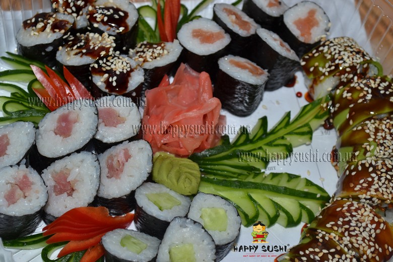 Happy sushi - надає Вам можливість доторкнутися до екзотичної та різноманітної японської кухні. Наш кур'єр привезе вам не просто їжу - Ви отримаєте оригінально оформлені, свіжі, смачні та корисні страви, і порадуєте не тільки свій шлунок та організм в цілому, але й душу!