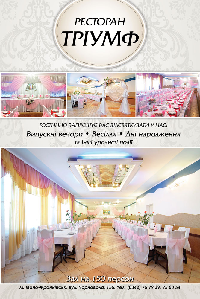 Ресторан ТРІУМФ гостинно запрошує на святкування весіль, випускних вечорів, днів народжень та інших урочистих подій.